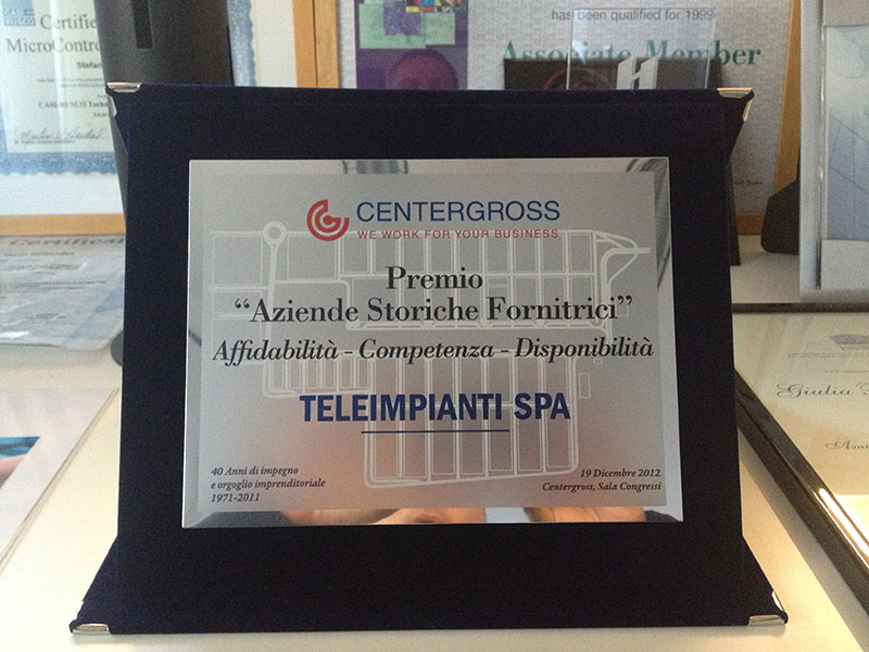 Nell’ambito delle celebrazioni dei 40 anni del Centergross, Teleimpianti SpA è stata premiata quale azienda storica fornitrice per essersi distinta per affidabilità, competenza e disponibilità.